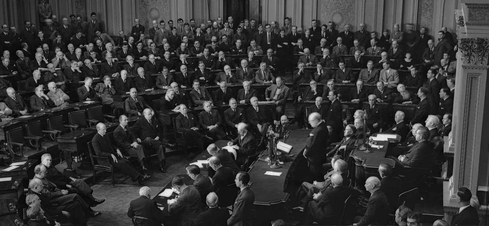 Prime Minister Churchill today assured Congress that by 1943 Britain and the United States will be ready to “take the initiative on an ample scale.” At the joint congressional session in the Senate chamber members of the Supreme Court were seated in left section of the first semi-circular row. Members of the cabinet, in center section, were (L-R) Secretary of the Treasury Morgenthau, Attorney General Biddle, Postmaster General Walker, Secretary of the Navy Knox, Secretary of the Interior Ickes, Secretary of Agriculture Wickard and Secretary of Commerce Jones. In right section (L-R) were Lord Beaverbrook, British Minister of Supply; an unidentified officer and Paul V. McNutt, Federal Security Administrator. (AP)